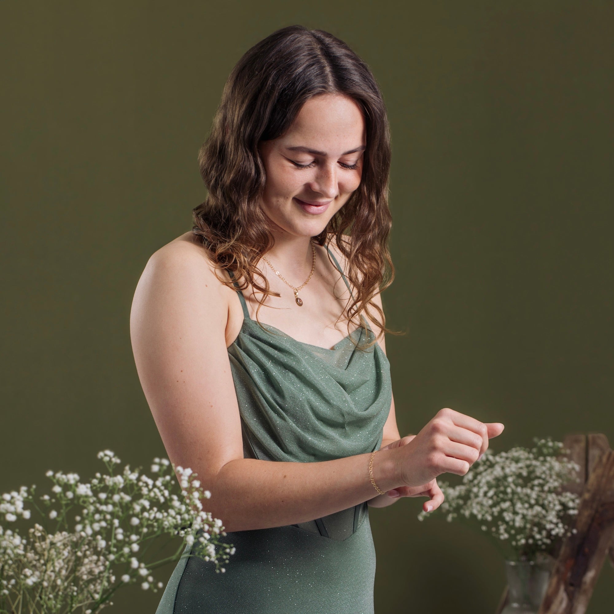 Blair besticht durch ihr zartes Design und ihr außergewöhnliches Funkeln. Die feinen, kreisrunden Glieder fangen bei jeder Bewegung das Licht ein und reflektieren es mit einem einmaligen Glanz – für einen Look, der Leichtigkeit und Eleganz perfekt vereint. Sie kann auf 3 verschiedene Arten getragen werden: mit Charm, ohne Charm als "O-Rundform" oder mit Verlängerungskettchen nach vorne für einen tollen Abschluss. Mit der Wahl deines Charms und der passenden Betonfarbe hast du maximale Flexibilität für deine persönliche Entfaltung. Die Halskette ist zudem durch ihre maximale Länge von 50cm und die Möglichkeit, sie individuell zu kürzen, das perfekte Schmuckstück fürs Layering. Sie besticht durch ihre elegante Leichtigkeit und ihren unverwechselbaren Glanz – ein Schmuckstück, das jedes deiner Outfits veredelt.