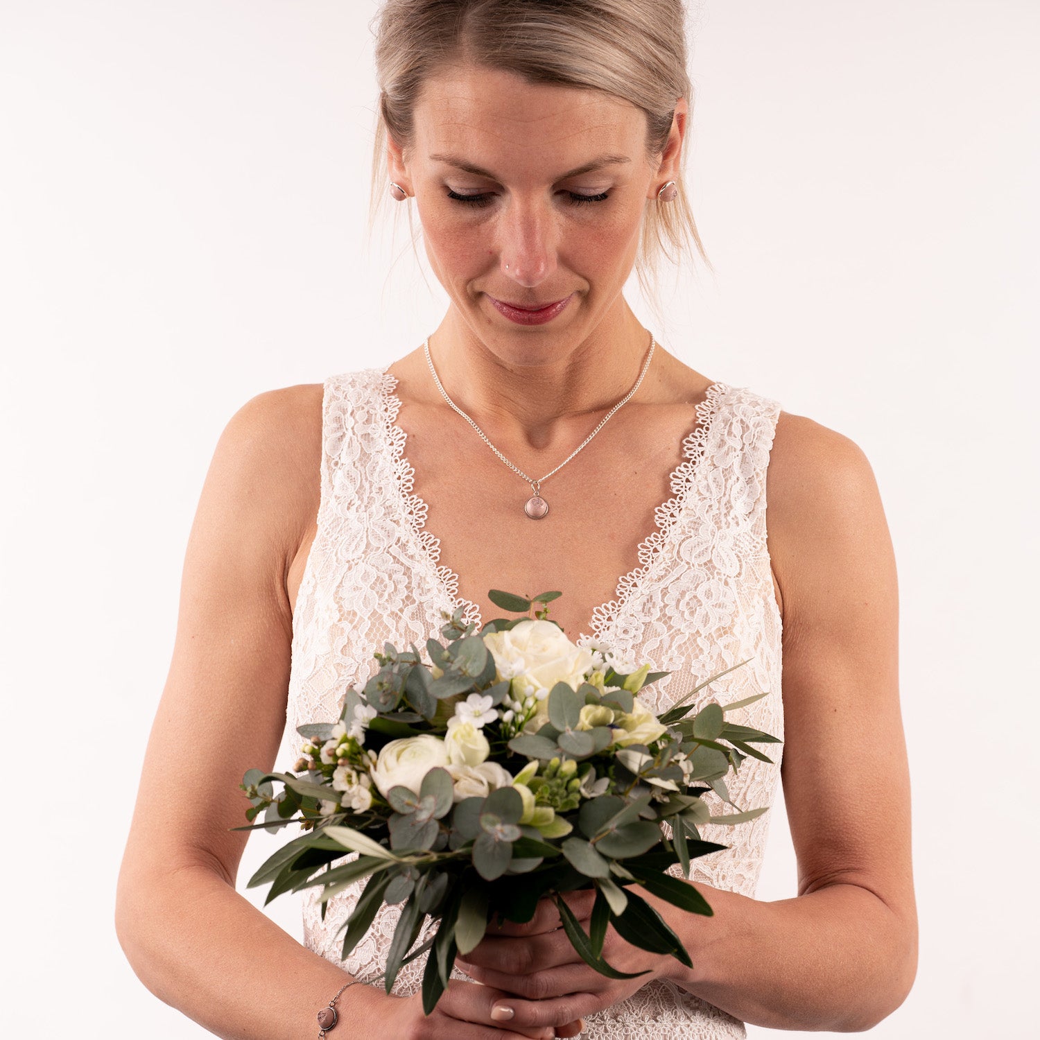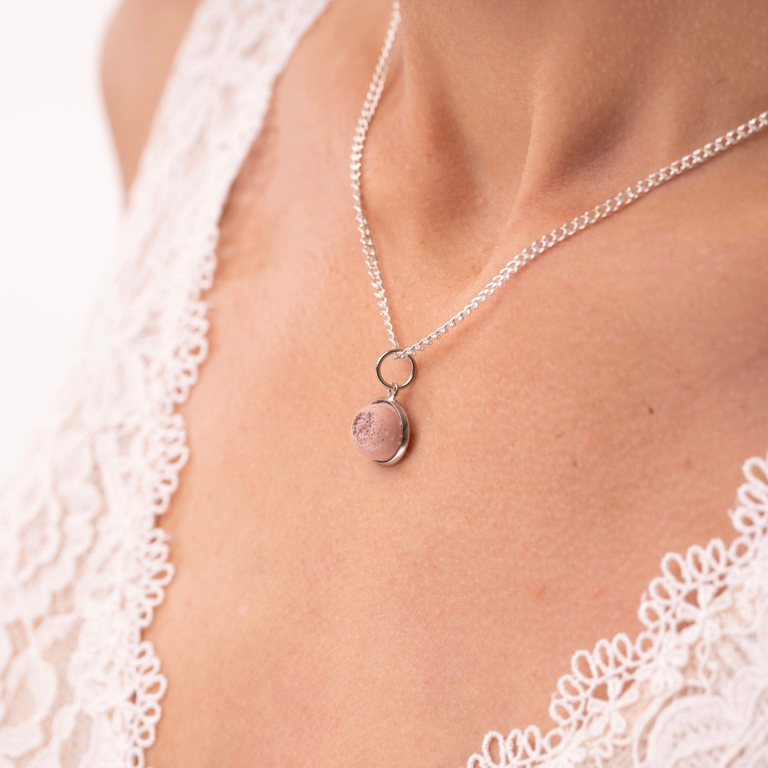 Samira ein echter Hingucker aus blushfarbenen Beton. Sie passt sich genau dem Farbton deines Kleides an und überzeugt zugleich durch ihre feine Eleganz. Die schimmernden Kügelchen setzen den einzigartigen Anhänger besonders in Szene. Dieses Unikat sollte in jedem Schmuckkästchen und Stil-Herzen einen ganz besonderen Platz haben, denn unser einzigartiger Schmuck