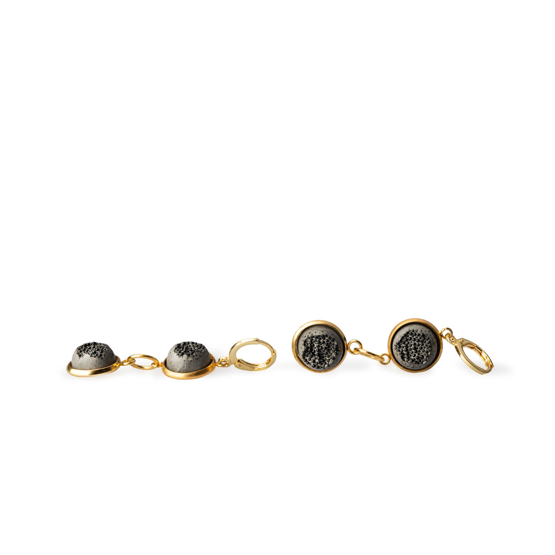* anthrazitfarbene Betonhalbkugeln mit schwarzen Kügelchen